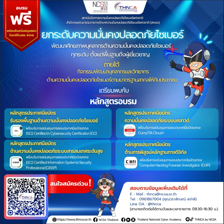 สถาบันวิชาการความมั่นคงปลอดภัยไซเบอร์แห่งชาติ สกมช. เปิดโอกาสให้บุคลากรด้านความมั่นคงปลอดภัยไซเบอร์ ทั้งภาครัฐ ภาคเอกชนแ...