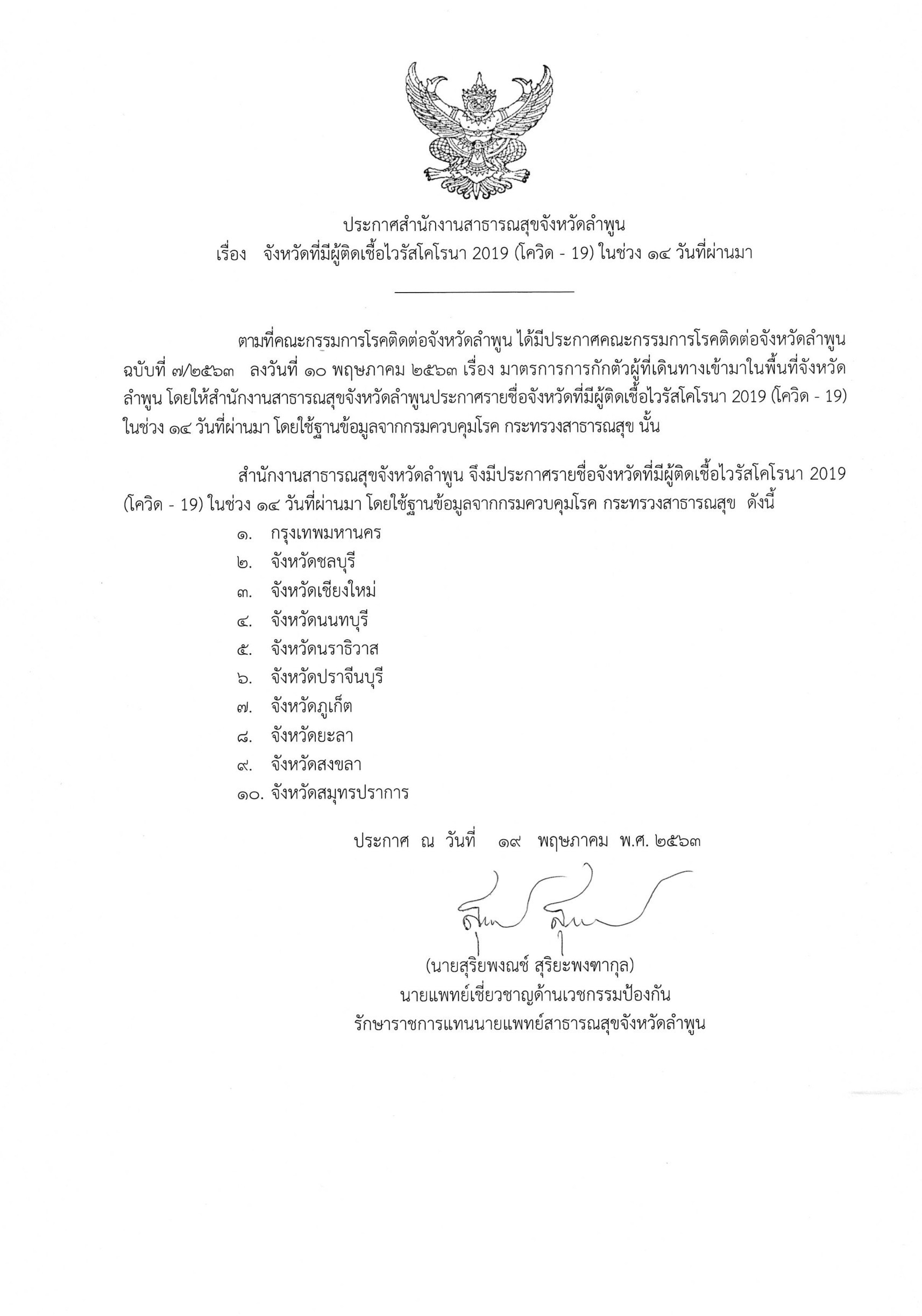 หัวข้อเอกสารเผยแพร่:: ประกาศคณะกรรมการโรคติดต่อจังหวัดลำพูน (Covid-19)