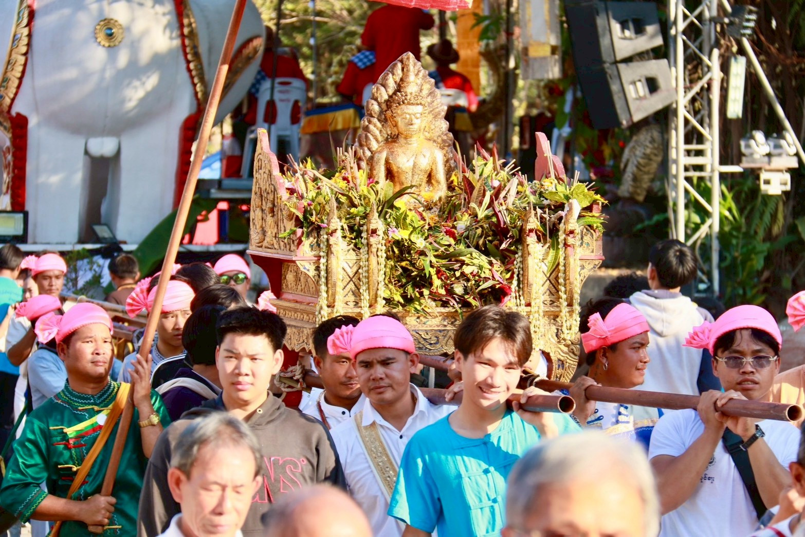 พ่อเมืองลำพูน นำคณะศรัทธาประชาชนเดินขบวนแห่พระรอดหลวง ในงานไหว้สาสักการะใส่ขันดอกพระรอ...