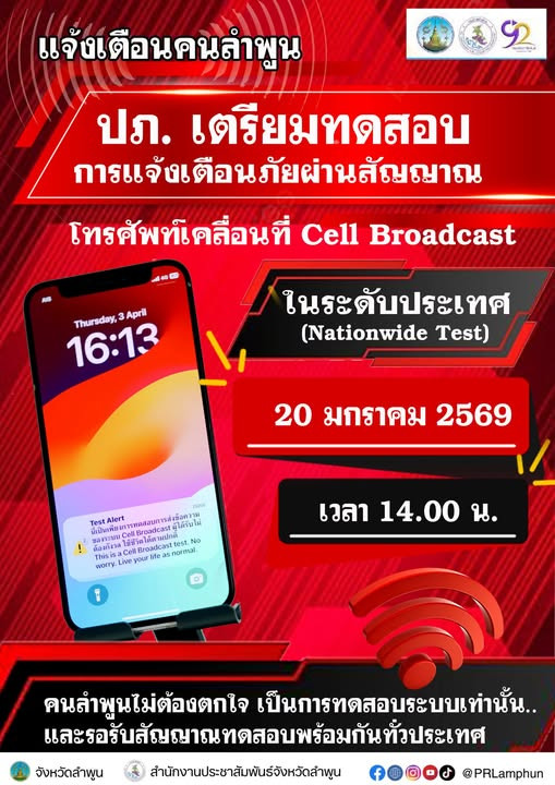 ขอประชาสัมพันธ์แจ้งเตือนคนลำพูน ปภ. เตรียมทดสอบการแจ้งเตือนภัยผ่านโทรศัพท์เคลื่อนที่ ผ่านระบบ...