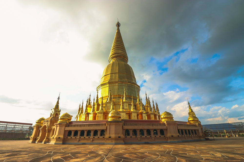 วัดมหาธาตุเจดีย์ศรีเวียงชัย ภายในโดดเด่นสง่างามด้วย พระมหาธาตุเจดีย์ศรีเวียงชัยสีทอง ตั้งเด่นตระหง่าน จนสามารถเห็นได้แต่ไกลทางหน้าทางเข้าวัด พระมหาธาตุเจดีย์ศรีเวียงชัยนี้ มีรูปทรงคล้ายชเวดากองจำลอง ถือเป็นสถาปัตยกรรมทางพระพุทธศาสนาศิลปะล้านนาที่สร้างด้วยศิลาแลงมีขนาดฐานกว้าง เท่ากับ 1 ไร่ และมีความสูง 64.39 เมตร โดยหลวงปู่ครูบาชัยยะวงศาพัฒนาเป็นผู้ริเริ่มให้มีการออกแบบและสร้างเพื่อเป็นพุทธเจดีย์ของพระพุทธเจ้า 5 พระองค์ อันจะเป็นพุทธเจดีย์ของภัทรกัป ให้ลูกหลานคนไทยได้กราบไหว้เป็นแห่งแรกของประเทศไทยและเป็นแห่งที่ 2 ของโลก